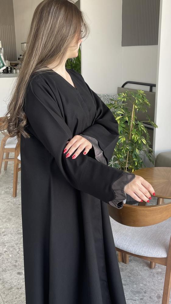 عباية مميزة و أنيقة لترافقك في لياليك المميزة بقماش كريب كتان كوري و سواد مميز مع حرير جاكار باليد و اضافة طقطق مجاني